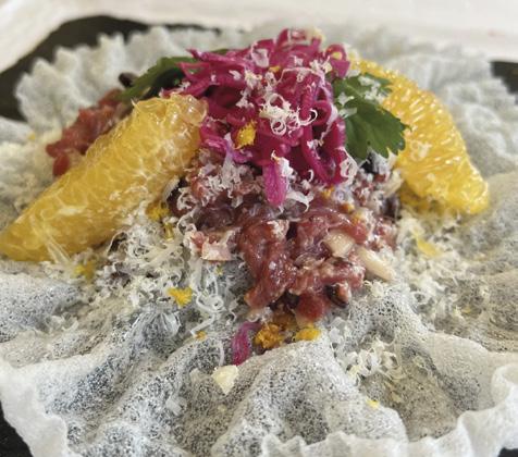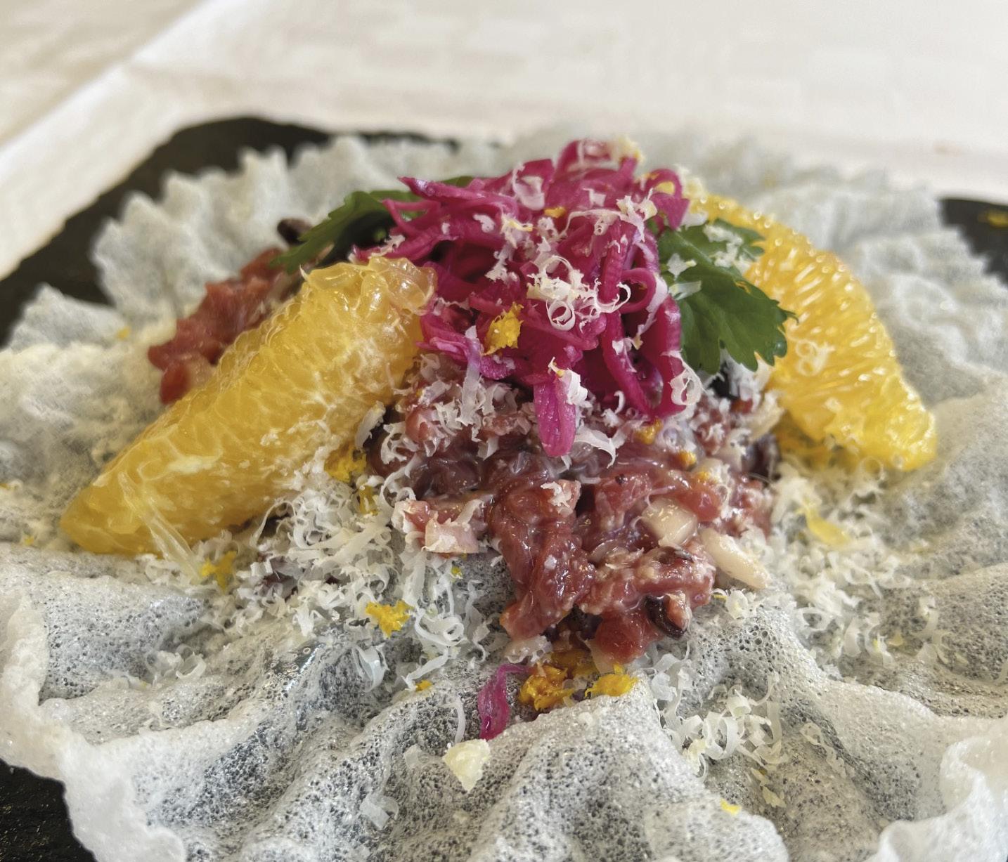 Råbiff på rispapper med smaker av sesamolja och blodapelsin toppad med picklad