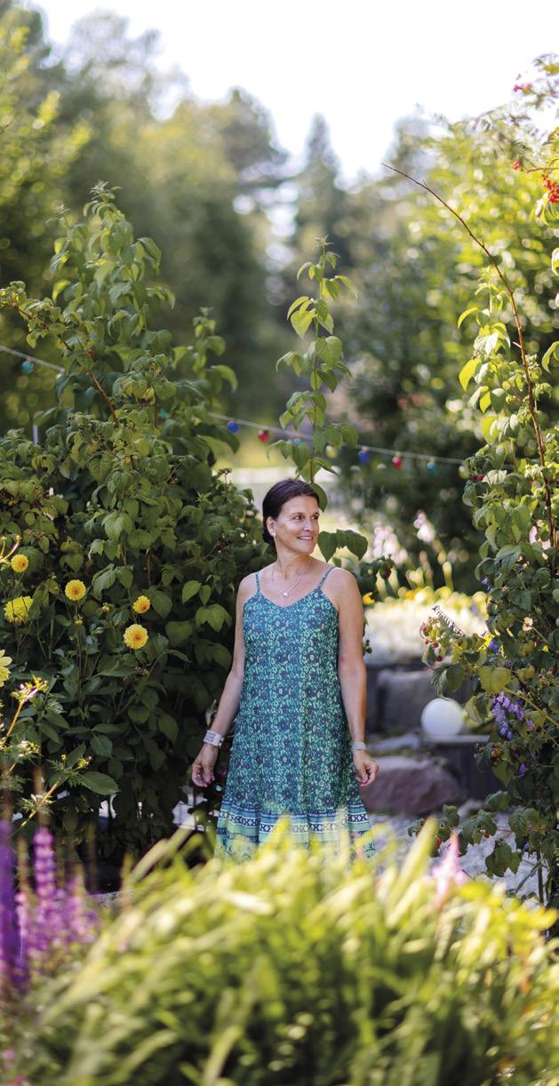 Sedan 1999 har hon här noggrant förvandlat det som från början bara var en gräsmatta till en grön oas med växter av alla dess slag. Förutom en kurs i vinterodling är hon helt självlärd.