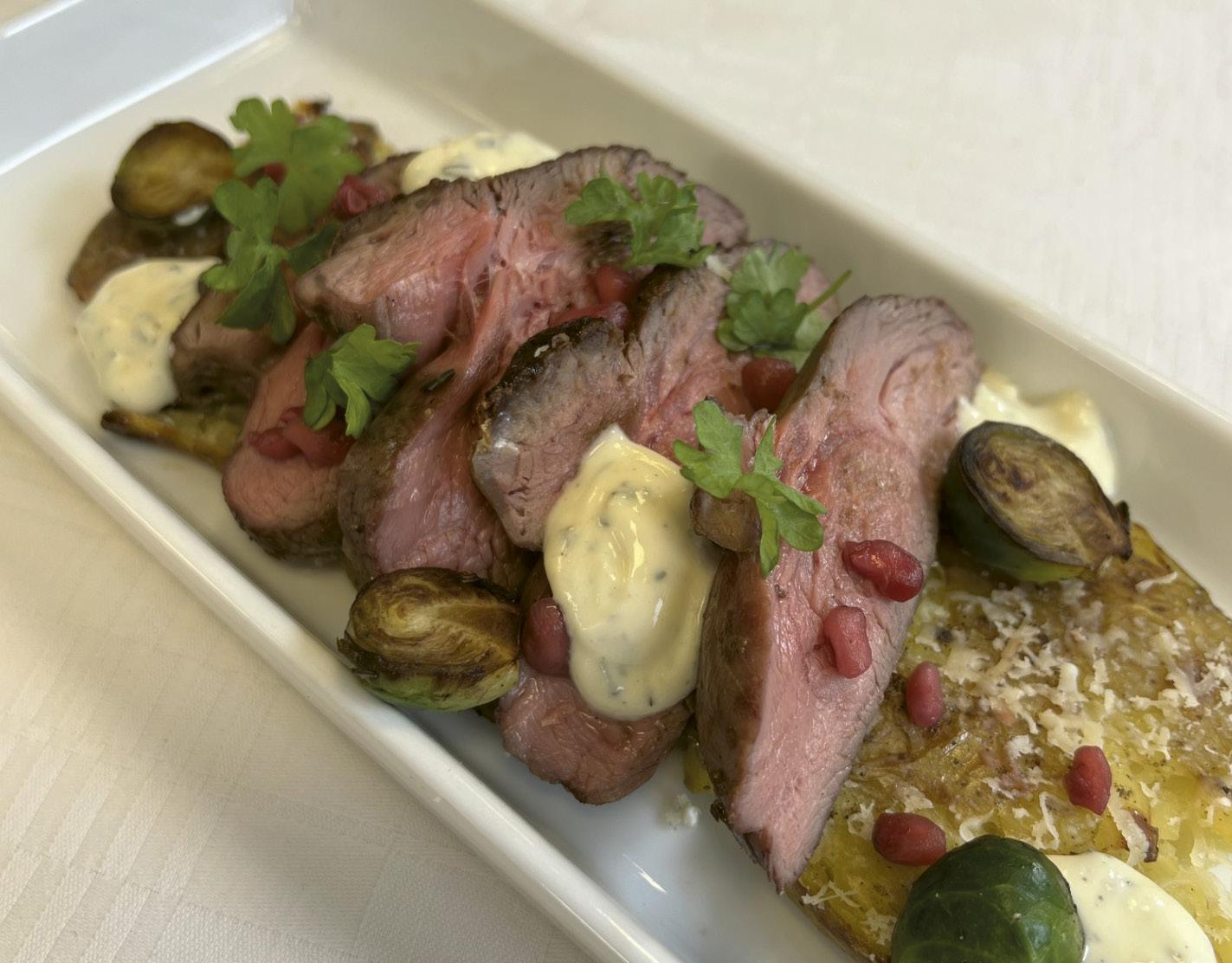 Stekt lamm med krossad potatis och parmesan, dragonkräm, smörstekt brysselkål och granatäpple.
