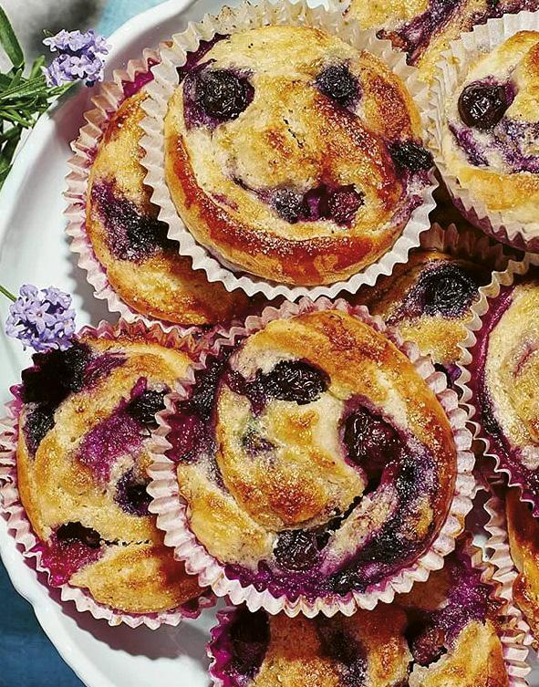 2. Sätt ut formarna på en plåt. Riv mandelmassan och rör ihop den med smöret. Blanda bären med potatismjölet. Tag upp degen på mjölad arbetsbänk och knåda den eventuellt med resten av mjölet. Kavla ut degen till en avlång platta, cirka 30 x 55 cm. Bred på mandelmassan och strö på blåbären. Rulla ihop från långsidan och dela degen i 25 lika stora bitar. Lägg dem i formarna. Låt bullarna jäsa övertäckta med bakduk cirka 45 minuter. Sätt ugnen på 250°C. Pensla bullarna med uppvispat ägg och strö på socker. Grädda mitt i ugnen cirka 8 minuter.