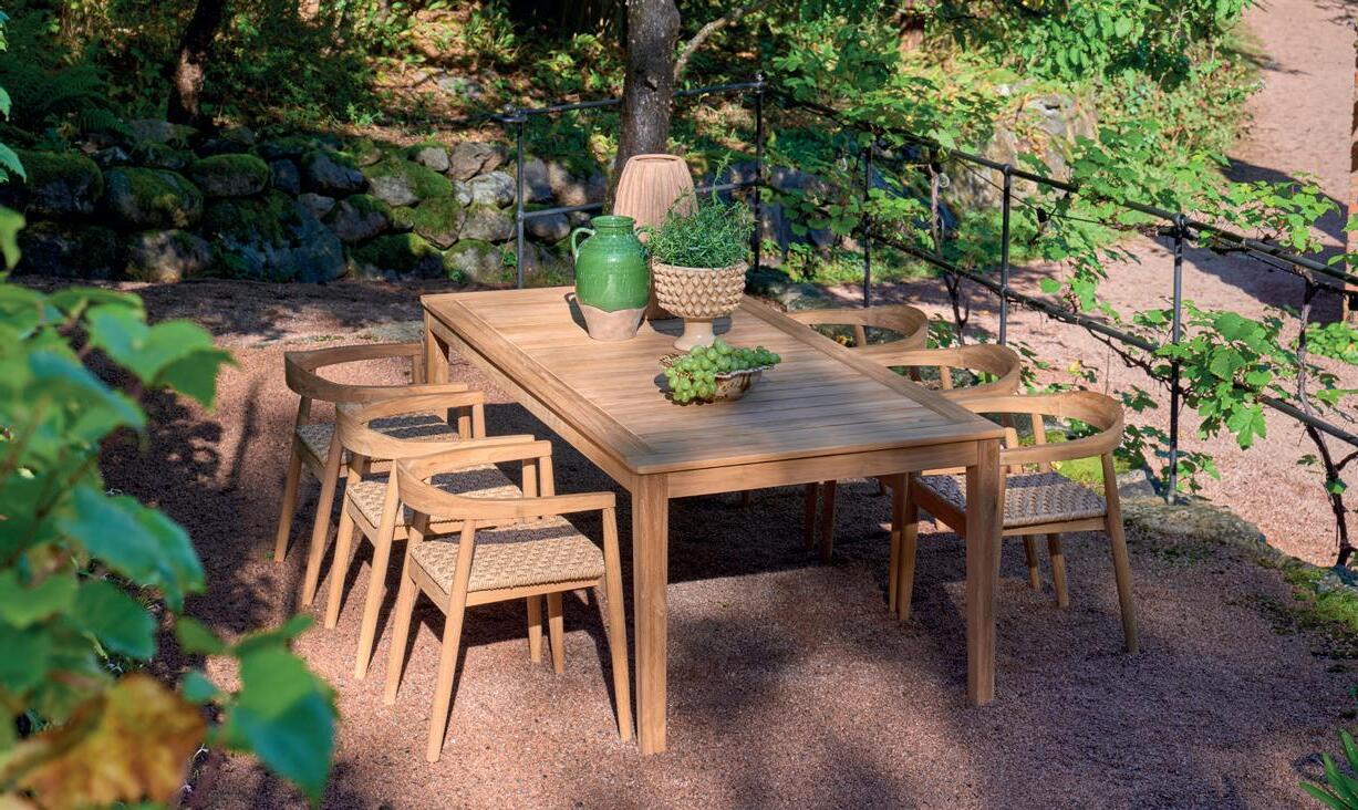 NYHET! Spisebord og spisestoler i teak. Med et naturlig oljeinnhold, er teak motstandsdyktig mot vær og vind.