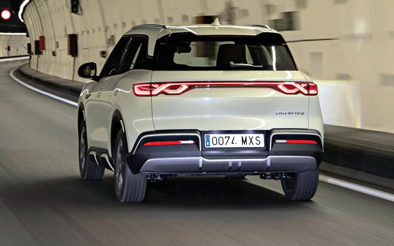 Belül sincs nyoma a Dolphinból és az Atto 3-asból megismert, óceán témának, jóval komorabb, letisztultabb és egyszerűbb a műszerfal, de a BYD-k jellegzetessége, a gombnyomásra függőleges po zícióba állítható érintőképer nyő – belépő felszereltségnél 10,1, a többinél 12,8 colos méret ben –, valamint a fejtámlával egybe épített első ülések azért nem maradtak ki. 8 GB memória és 8 magos processzor ga rantálja, hogy tényleg villámgyorsan fusson a fedélzeti menürendszer, amelynek több újítása is van a régebbi BYD-khoz képest. Az egyik, hogy a felhasználói felület csempés gyorsmenüje testre szabható, így könnyen létrehozhatunk egyénileg kiválogatott parancsikonokat tartalmazó oldalakat. Ez különösen akkor hasznos, amikor a BYD túlbuzgó és nem tökéletesen kalibrált vezetéstámogató rendszereinek szóbeli figyelmeztetéseit, pittyegéseit, bimbammolásait szeretnénk elhallgattatni. Szintén remek újítás, hogy a klímát már egy speciális, háromujjas technikával is lehet szabályozni az érintőképernyőn, mintha egy MacBookot használnánk. A középkonzolon a legfontosabb funkciókhoz, például a szélvédő-párátlanításhoz, a menetmód-választóhoz és a fékenergia-visszatápláláshoz fizikai gombok tartoznak, a menetirány választó pedig kristályüvegre hasonlít, amivel a prémiumautókat koppintja a BYD. Jól mutatnak a középkonzol szélein és az ajtókon látható, megvilágított, háromszög alakú kapaszkodók, amelyektől olyan érzése lesz az embernek, mintha terepjáróban ülne. Ez persze távol áll az igazságtól, az Atto 2-nek ugyan viszonylag nagy a hasmagassága, de még lejtmenetvezérlője