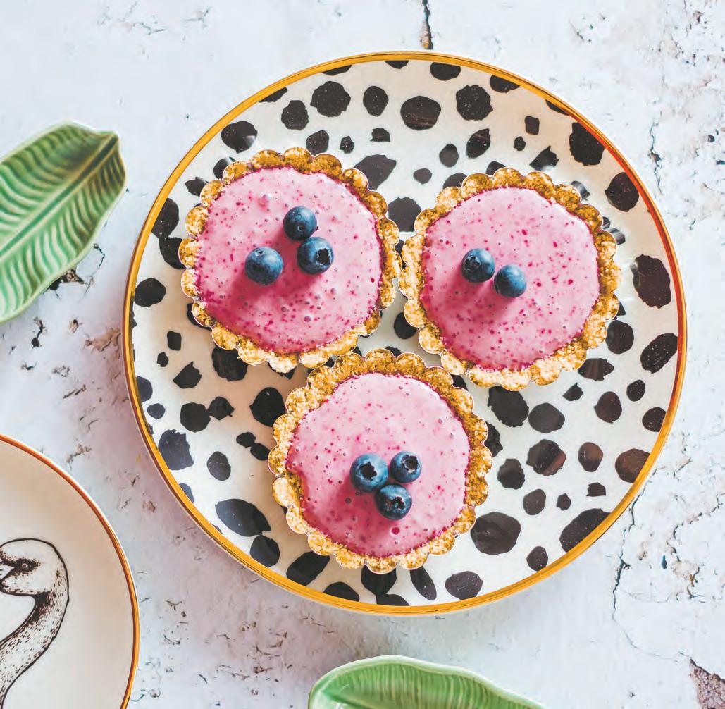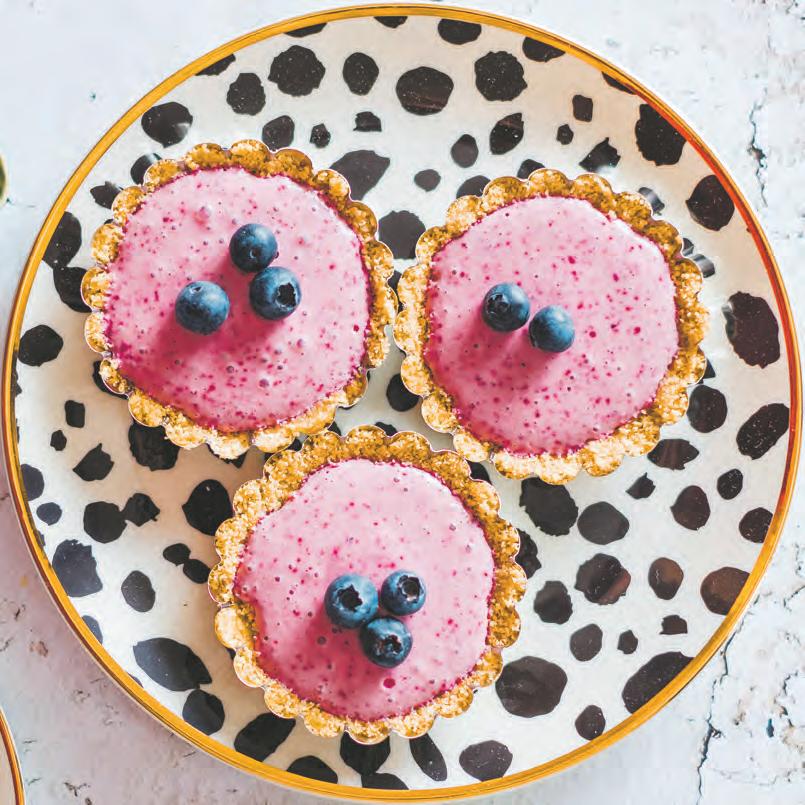 A natúr görög joghurtot édesítsük a mézzel vagy az agávésziruppal, és t urmixoljuk össze a megmosott áfonya 2/3-ával. Kanalazzuk az áfonyás joghurtot is a formákba, majd díszítsük a kosárkák tetejét a maradék gyümölccsel.