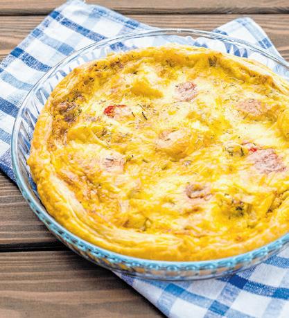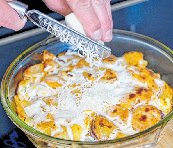 Géza a beszélgetés közben egy ízgazdag, tradicionális rakott krumplit készített, hiszen a töltött káposzta mellett ez az egyik kedvence. Ehhez sós vízben megfőzött 1 kg krumplit héjával és hat tojást. A burgonyát meghámozta és 2 cm-es szeletekre vágta, majd az ugyancsak megfőtt tojást a tojásszeletelővel vékonyra vágta. Az ízlés szerinti mennyiségű kolbászt egy kicsit elősütötte a sütőben, hogy kiengedje a zsírját. Mint mondta, ő a kolbászt nagyobb szeletekre vágja, így teszi a rakott krumpliba, amit jénai tálban süt meg 200 fokos sütőben. A tálba rétegesen helyezi el a felszeletelt krumplit, a tojást, aztán újra egy réteg krumplit és tojást, a tetejére pedig sűrű tejfölt tesz. Mint mondta, fontos, hogy minőségi legyen a tojás és a krumpli, ahogyan a kolbász is. Géza elárulta: a hozzávalókat a piacról veszi, de a kolbász más kérdés. – Évente kétszer vidéki „portyára” megyek kedvenc kolbászkészítőmhöz, aki a gyerekeit és unokáit már egyévesen megkóstoltatta a finom háztájival, engem pedig rendre békési finomságokkal köszönt.