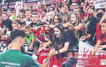 Szoboszlai Dominik dedikálja a mezét Beliczay Rékának a Magyarország–Csehország mérkőzésen