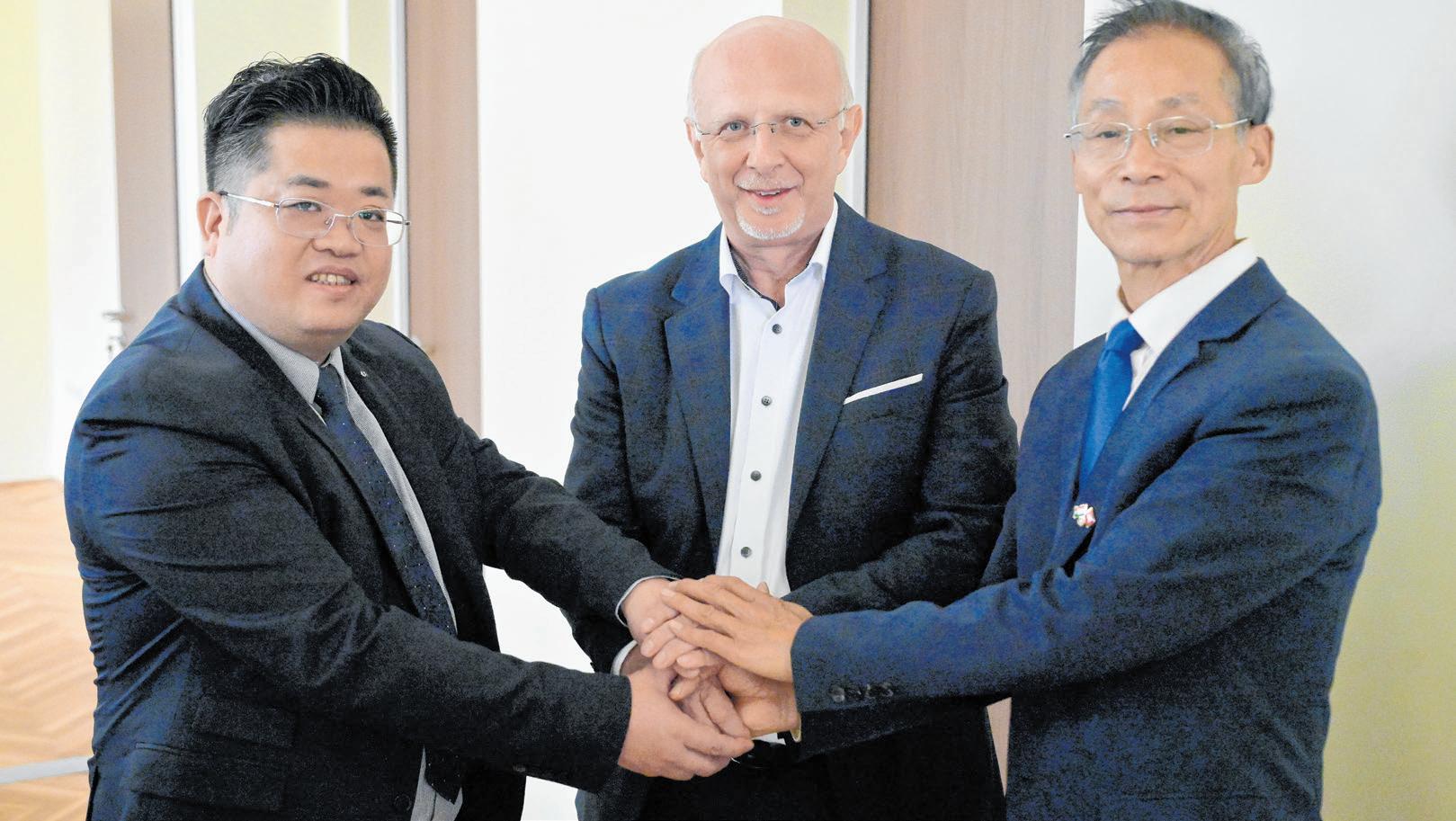 Nógrádi Zoltán polgármester és Peter Chen, a Magyar–Kínai Merchants Office Ltd. ügyvezető elnöke az aláíráskor. FOTÓ: TÖRÖK JÁNOS