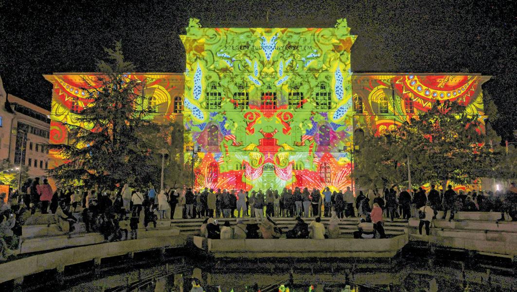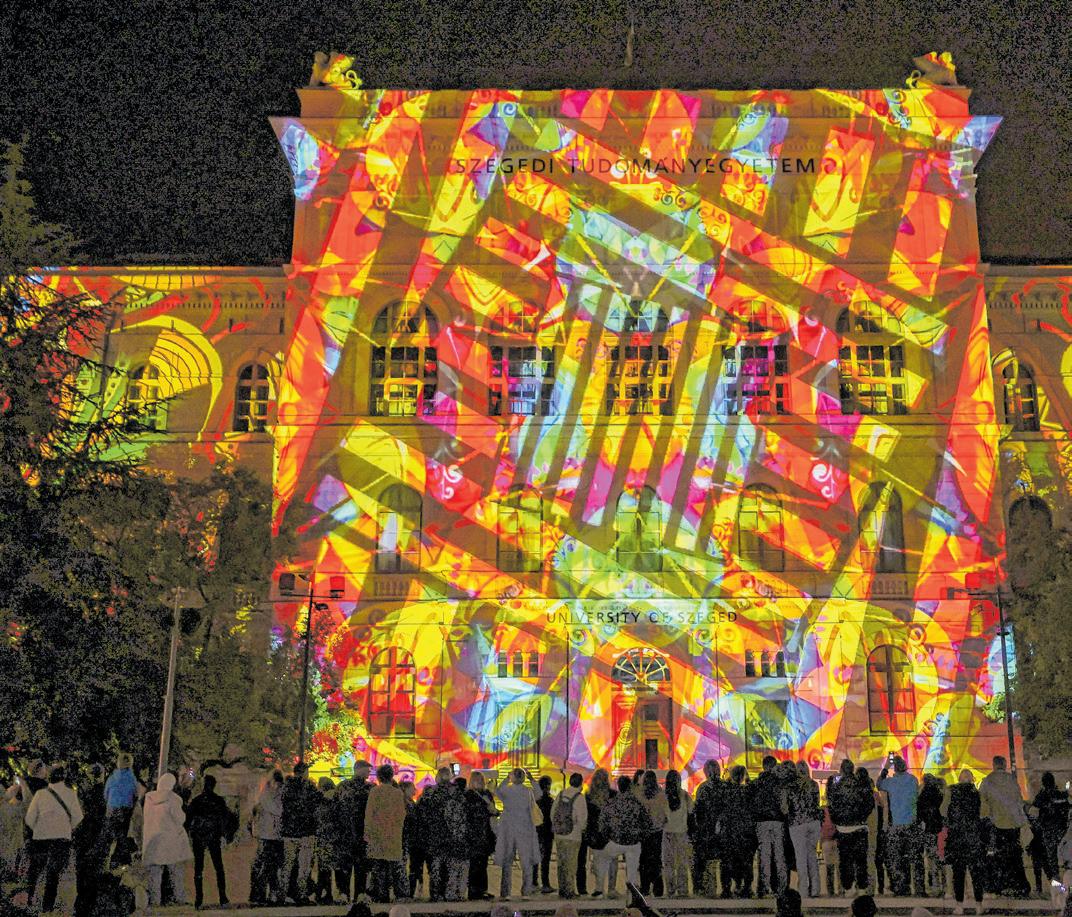 Koncertek, kiállításmegnyitók, könyvbemutatók, kerekasztal-beszélgetések, színházi és tudományos el ő adások is szép számmal kaptak helyet a szegedi Ő szi Kulturális Fesztivál programkínálatában. Hét héten át, hetven helyszínen, háromszáz programmal várják a látogatókat. A fesztivál nyitóestéjén ezúttal is szemet gyönyörködtető fényárba borították a szegedi egyetem rektori hivatalát. A fényfestés során gigantikus falevelek hulltak alá, színpompás óriásvirágok nyíltak az épületen. FOTÓ: KARNOK CSABA