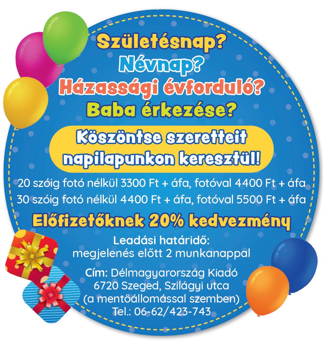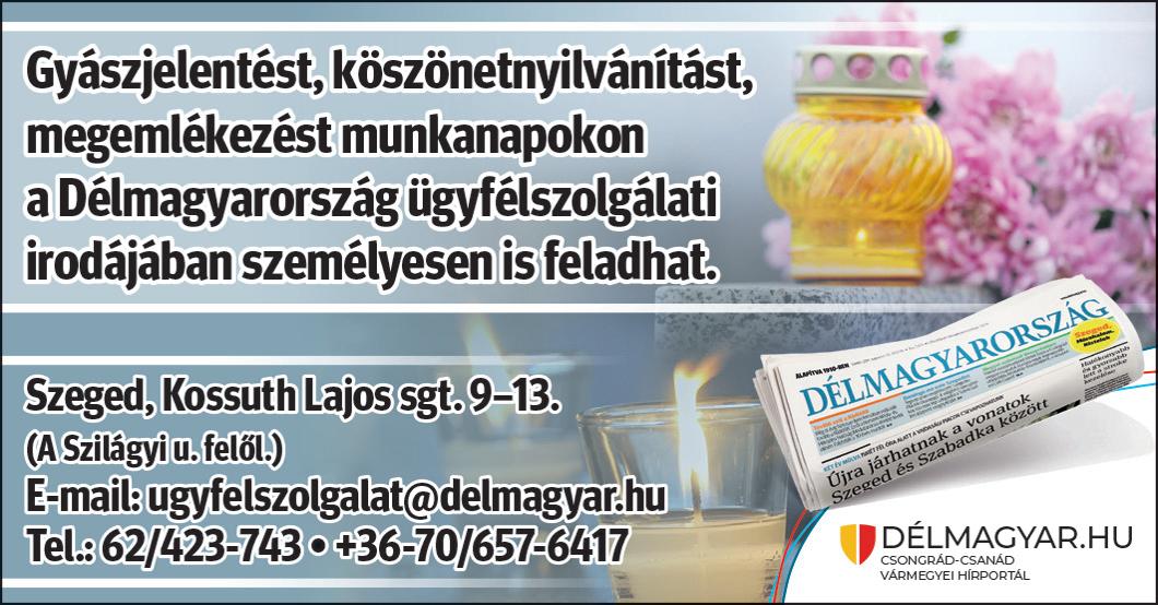 Kiadja a Mediaworks Hungary Zrt. Szerkesztőség és kiadó: 6729 Szeged, Szabadkai út 20., tel.: 62/998-100 Ügyfélszolgálati iroda: Szeged, Kossuth Lajos sgt. 9–13., tel.: 62/423-743 Előfizetői, terjesztési ügyfélszolgálat: 62/998-120, terjesztes@delmagyar.hu. Előfizetői ügyfélszolgálatunk digitálisan elérhető az ugyfelszolgalat.mediaworks.hu címen. Előfizetési díj: 4490 Ft/hó, 13 390 Ft/3hó, 26 690 Ft/6hó, 53 090 Ft/12hó. Telefonos hirdetésfelvétel: 80/442-233 Nyomda: Mediaworks Hungary Zrt., 6729 Szeged, Szabadkai út 20. Tel.: 70/657-6439. Felelős vezető: Marancsik Roland. Megrendelhető a Mediaworks Zrt.-nél, a társaság kézbesítő inél és az ügyfélszolgálati irodákban. Az előfizetés esetleges lemondását csak írásban (személyesen, levélben, e-mailben) minden hónap 25-ig tudjuk elfogadni. Adatvédelmi irányelveink a www.delmagyar.hu internetes oldalon olvashatóak. Példányszámunk valódiságát a MATESZ hitelesíti. ISSN: 0133-025X (Délmagyarország) 2064-7875 (Csongrád)