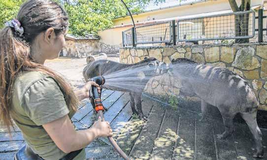 Többféle módon igyekeznek elviselhetővé tenni a gondozók a korábbi napokban tapasztalt hőséget a debreceni állatkert lakóinak. A vörös pandákat például hűsítő és minden bizonnyal ízletes fogással kínálta Molnár-Nagy Ágnes: többek között banánt és szőlőt fogyaszthattak, s eldönthették, hogy elnyalogatják, mint a fagyit, vagy inkább kikaparják a jégtáblából. /5. FOTÓ: CZINEGE M.