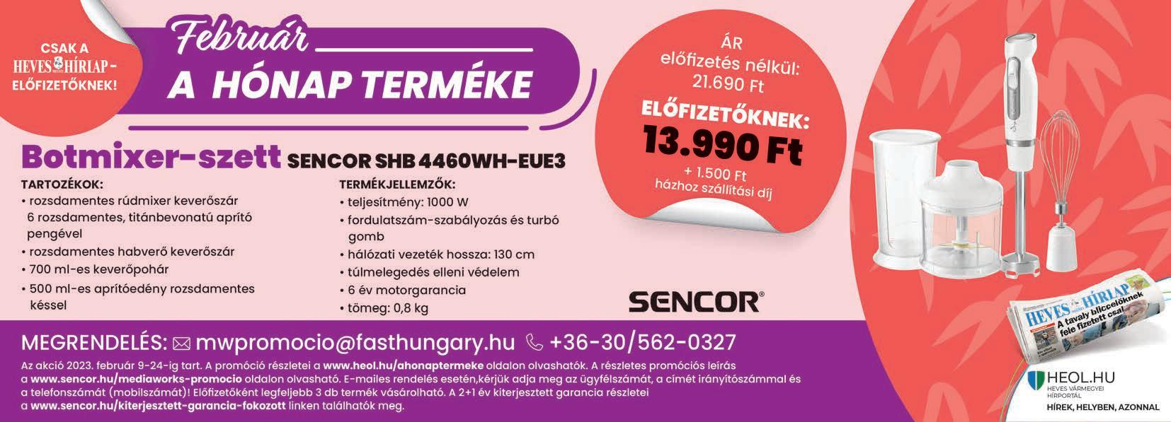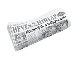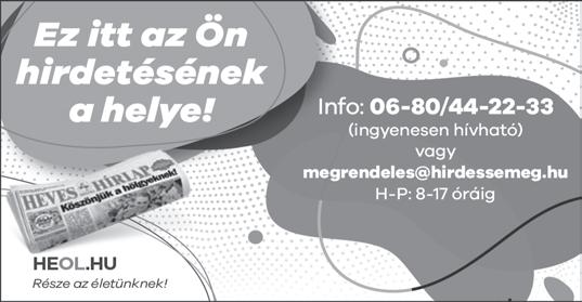 EGY PERCBEN SZERKESZTŐSÉG: E-mail: szerkesztoseg@hevesmegyeihirlap.hu OLVASÓSZOLGÁLAT 36/999-111 TERJESZTÉS – kézbesítéssel kapcsolatos problémák esetén 46/998-800 HIRDETÉS – ha hirdetni kíván lapunkban, ezt a számot hívja 36/513-628 2023. FEBRUÁR 16., CSÜTÖRTÖK • XXXIV. ÉVFOLYAM, 40. SZÁM. ÁRA: 275 FT. ELŐFIZETVE: 158 FT. WWW. HE OL.HU HIRDETÉS *659608*