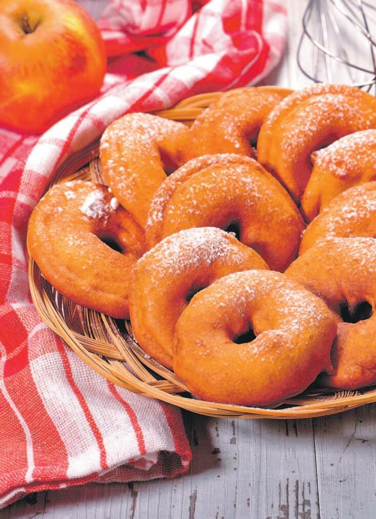 Hozzávalók (20 darab): 5 nagy alma • 4 dl olaj a sütéshez A tésztához: 400 g liszt • 4 dl tej • 1 dl szénsavas ásványvíz • 3 tojás • 1 ek. cukor • 1 kk. só A beszóráshoz: 100 g porcukor • 1 kk. fahéj