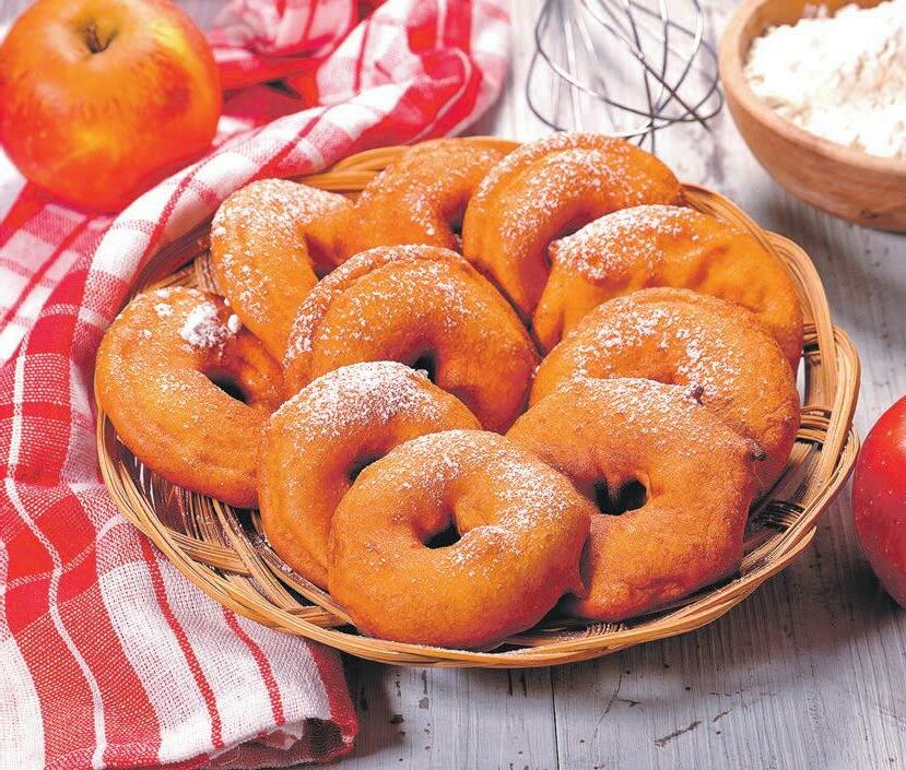 5 nagy alma • 4 dl olaj a sütéshez A tésztához: 400 g liszt • 4 dl tej • 1 dl szénsavas ásványvíz • 3 tojás • 1 evőkanál cukor • 1 kk. só A beszóráshoz: 100 g porcukor • 1 kk. fahéj