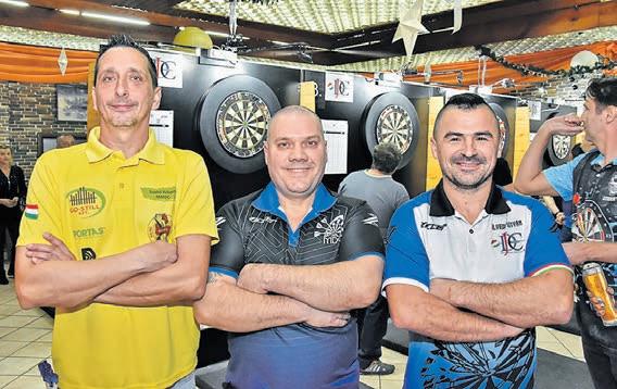 Szabó Róbert, a mosonmagyaróvári, Bokodi István, a halászi és Ölvedi István, a jánossomorjai klub vezetője. A Kisalföld Darts Liga az összefogásról is szól. FOTÓ: KEREKES ISTVÁN