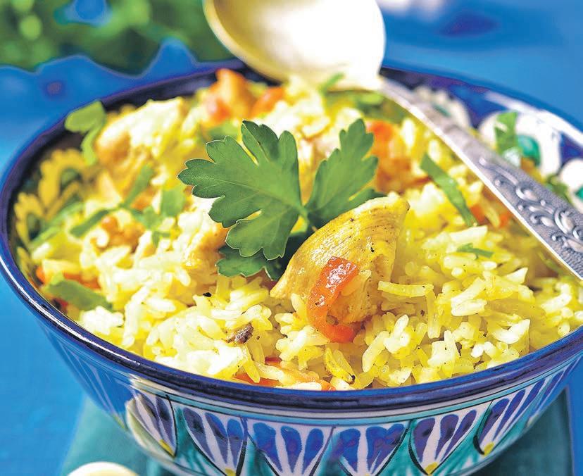 900 g hosszú szemű rizs • 400 g pulykamell • 2 közepes sárgarépa • 200 g zöldborsó • 2 szál zöldhagyma • 1 babérlevél • 1 teáskanál sáfrány • 3 evőkanál olívaolaj • 1 teáskanál só • 1 l csirkealaplé