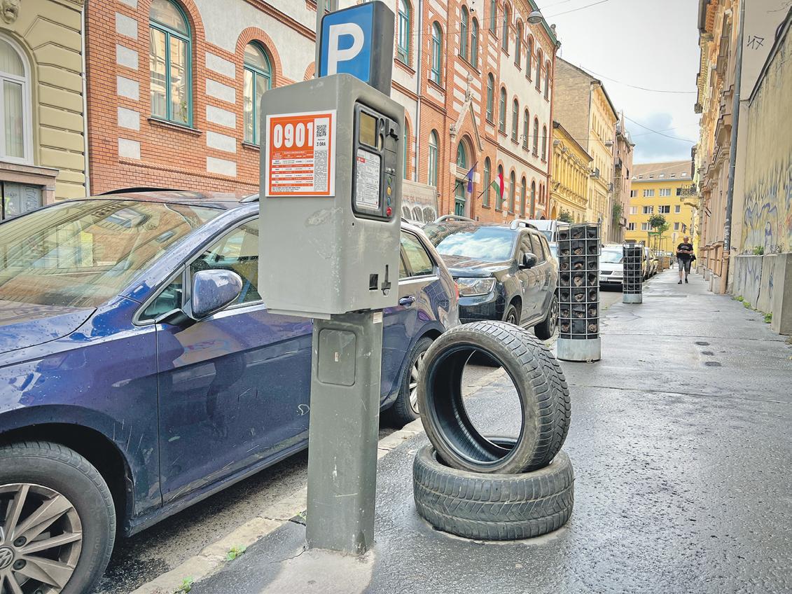 Kettő az egyben szolgáltatás: miután elindítottuk a parkolóórát, akár jöhet is az autószerelő lecserélni a gumikat. Már ha éppen passzol ez a két utcán árválkodó autógumi az abroncsra.