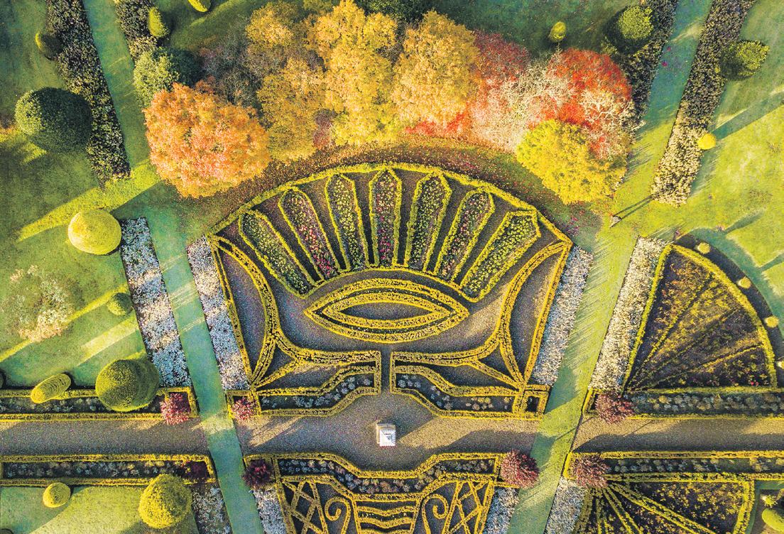A légi felvételek a Crieff, Perth és Kinross közelében található Drummond House and Gardenst mutatják be vörös és sárga levelekkel.