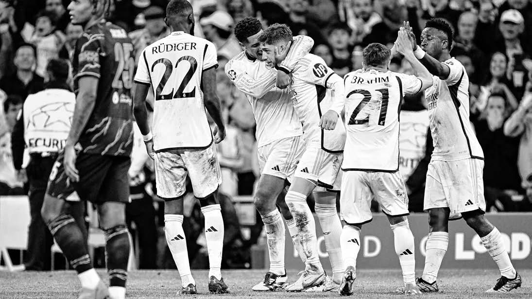 Federico Valverdét ölelgetik a Real Madrid játékosai, miután góljával kiegyenlített a Manchester City ellen Fotó: AFP