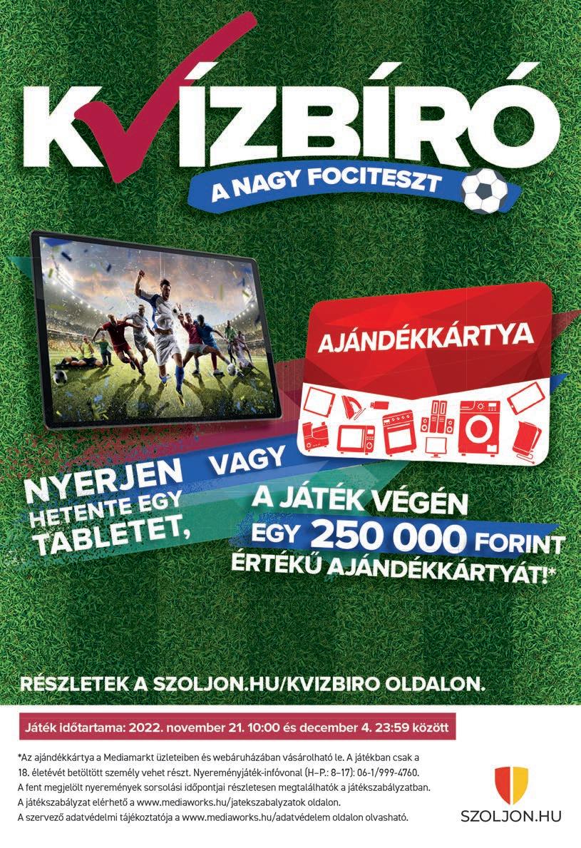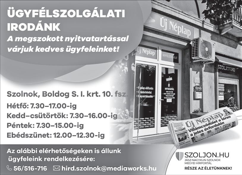EGY PERCBEN 2022. NOVEMBER 28., HÉTFŐ • XXXIII. ÉV FOLYAM, 277. SZÁM. ÁRA: 235 FT. ELŐFIZET V E: 158 FT JÁSZ-NAGYKUN-SZOLNOK MEGYEI NAPILAP WWW. SZOLJ ON.HU OLVASÓSZOLGÁLAT 8–16 óráig 56/999-111 TERJESZTÉS 8–16 óráig – kézbesítéssel kapcsolatos problémák esetén 46/998-800 HIRDETÉS 8–16 óráig – ha hirdetni kíván lapunkban 56/516-716 SZERKESZTŐSÉG: E-mail: ujneplap@ujneplap.hu HIRDETÉS HIRDETÉS *653203*