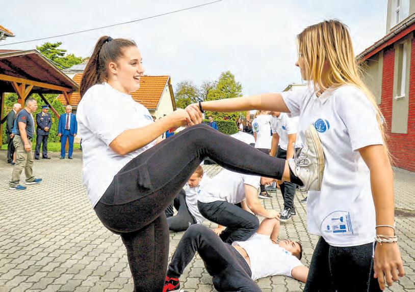 Önvédelmi bemutató is lezajlott a Zsigmondy udvarán. Elöl a rendészet és közszolgálat ágazat két diákja, Benczik Viktória és Hári Hanna Fotó: Szakony Attila