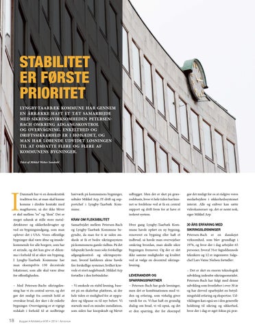 Stabilitet er første prioritet Lyngby-Taarbæk Kommune har gennem en årrække haft et tæt samarbejde med sikringsvirksomheden PetersenBach omk ring adgangskontrol og overvågning. Enkelthed og driftssikkerhed er i højsædet, og man har løbende udvidet løsningen til at omfatte flere og flere af kommunens bygninger. Tekst af Mikkel Weber Sandahl