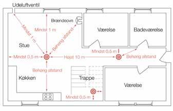 Figur 4. Principskitse med angivelse af anbefalede afstande fra røgalarm til anden røgalarm og f.eks. vinduer, ventilationsåbninger, hjørner, vægge, komfur, brændeovn