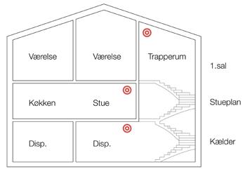 Figur 5. Principskitse med angivelse af anbefalede placeringer af røgalarmer i boliger med flere etager