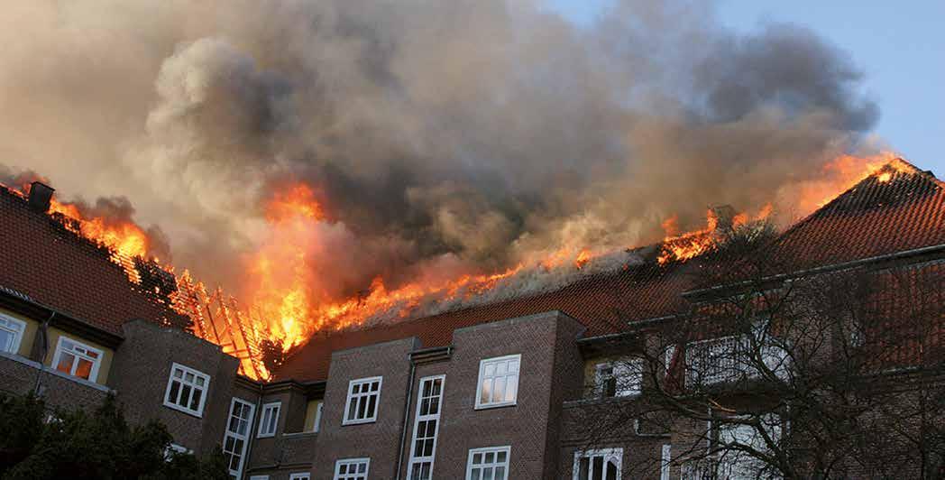 En boligejendom, hvor en brand har bredt sig til hele tagetagen