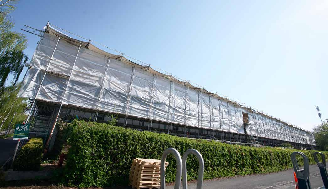 Heibing Stilladser har f.eks. sat stillads op om fem af syv Bellahøjhuse, der skal gennemgå en renovering, og så rejser stilladserne sig også rundt om Hedemarken i Albertslund. Her har montørerne blandt andet etableret hejs med løbekatte under taget, og der er påmonteret asbesttelt.