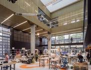 Her er et stort fællesskab af forskellige forskere, studerende og iværksættere altid i færd med at ud vikle opfindelser som robotter der kan høste grønt sager eller drager der skal forvandle vind til energi. Betongulvet mellem de gyldne vægge er befærdet med gaffeltrucks, caféen lokker med kaffeduft, og i loftet hænger der en raket.