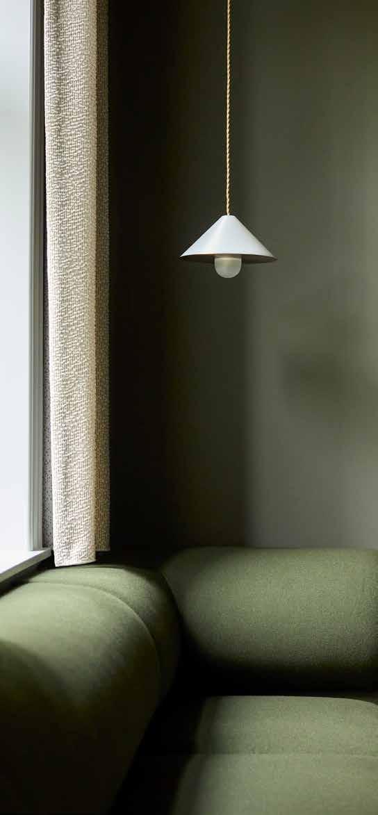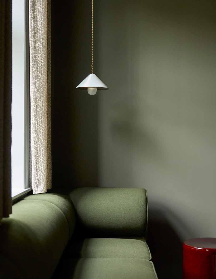 for Brdr. Krüger, John Pawson- design for Dinesen og vintageikoner af Arne Jacobsen og Severin Hansen. Væggene er malet i dæmpede nuancer – udviklet af Thulstrup – for at fremhæve træets naturlige glød. Gardiner, tæpper og polstring fra Kvadrat-familien tilfører tekstur og akustik – og understøtter materialets tilstedeværelse på flere niveauer.