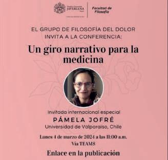 El 4 de marzo de 2024, la Dra. Pamela Jofré presentó la conferencia “Un giro narrativo para la medicina” invitada por el grupo de Filosofía del Dolor de la Pontificia Universidad Javeriana de Colombia.