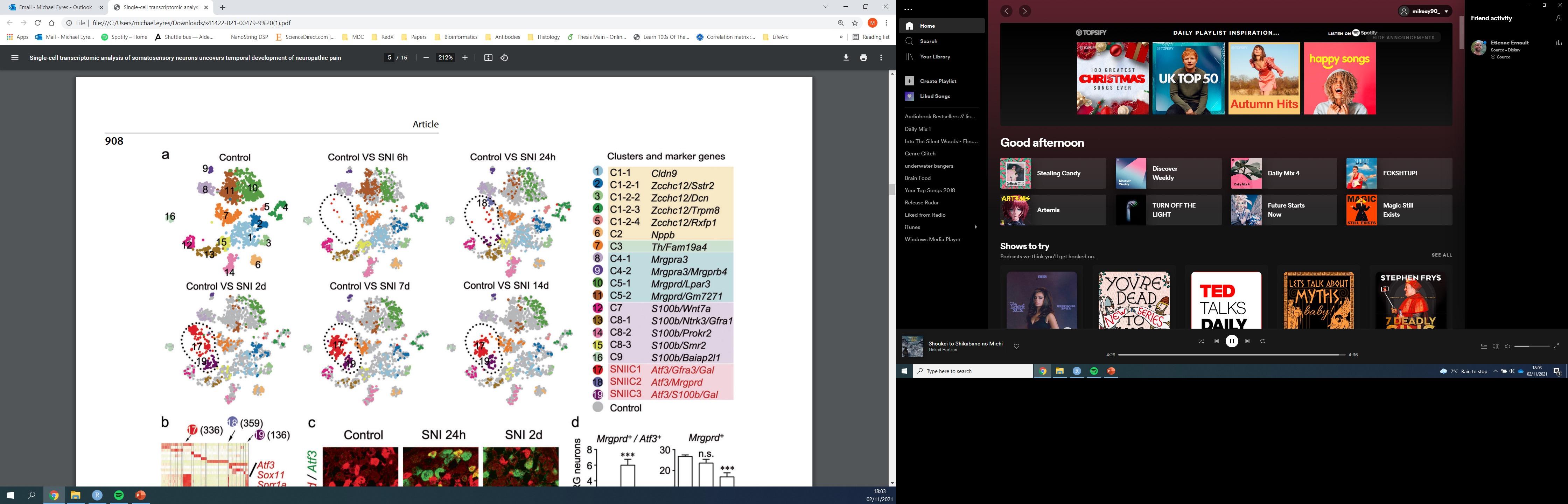 and mouse (and selected canine) probe panels available Quantitative, non-destructive, spatial proteomics and transcriptomics FFPE or fresh frozen tissue sections or TMAs Morphology Markers • Can be selected from a host of pre-validated antibodies (E.g. GFAP (Astrocytes); Iba1 (Microglia), NeuN (Neurons), Amyloid-β (Plaques)) New markers bespoke to each project can additionally be validated in house Can including segmentation and contouring GeoMx® Digital Spatial Profiler • Luminex and Simoa platforms perform bead-based immunoassays, enabling simultaneous multiplex detection of up to 100 analytes Pre-validated Assays • Various commercially pre-validated assays are available and can be run in house on the Luminex MAGPIX instrument Catalogues with >600 validated human analytes (includes several multiplex neuroscience/ neurodegeneration panels) • NF-H (but not NF-L), Tau (Total and phospho (pT181 + pT231)), TDP-43 Customised Assays Assays to targets not commercially available can be built and validated in house (E g NF-L assay validated in house) Several neuro focused assays are currently being validated for use with both human and mouse CSF and plasma samples Protein Multiplexing (Luminex® and Quanterix™ Simoa ® Platforms) NF-L Total Tau pTau (181 or 231) Pre-validated Assays 3mm 3mm 3 x 3mm coverslip coated with a monolayer of 10µm diameter DNA barcoded beads • The unique barcode on each bead enables the location to be determined • A section of frozen tissue is melted onto the tile where the mRNA binds to a poly(dT) tail on each bead, allowing the locations of the RNA transcripts to be deduced by sequencing Clustering analysis identifies groups of cells present with similar expression profiles Robust Decomposition single-cell to identify present in The spatial position of each cell type can then be mapped. Mass Spectrometry Imaging Small molecules Metabolites Lipids • Peptides/proteins MSI Analytes • Label free surface analysis of samples (E g tissue/ dried blood spots) for a variety of analytes Possible to analyse different molecular classes from a single section Relative/semi-quantitation • Can be correlated and overlaid with microscopy or DSP images (on same or consecutive sections) Lipidomic Profiling in Human Spinal Cord Tissue Amyotrophic Lateral Sclerosis (ALS) is a fatal neurodegenerative disorder characterised by the loss of motor neurons in the brain and spinal cord, with approximately 15% of patients additionally developing a form of Frontotemporal Dementia (FTD) • The dysregulation of lipid metabolism is a common hallmark of a range of neurodegenerative diseases, including ALS Mass Spectrometry Imaging (MSI) A collection of lipids and metabolites previously recognised to be associated with anti-inflammatory pathways was spatially profiled across human spinal cord tissue using MSI The snap frozen tissue was additionally H&E stained in order to define the anterior and posterior orientation One of the lipids, the omega-3 polyunsaturated fatty acid Docosahexaenoic acid (DHA), was found to be increased in the grey matter of the spinal cord in ALS and FTD-ALS patients Docosahexaenoic Acid (DHA) MSI Image of the distribution and abundance of DHA across human spinal cord tissue High Abundance Low Abundance Posterior Anterior GFAP • TDP-43 Aβ40 or Aβ42 Transcriptome Profiling • Whole Transcriptome Atlas- profiling of >18,000 protein coding genes Multiplexed Protein Panel Panels of 20 – 80 proteins (Immuno-oncology and neuroscience focused) • Customised assays, barcoding bespoke antibodies can additionally be validated and added into the multiplex panels Profiling Panels Technologies and Platforms Spatial Protein Profiling in Neurodegeneration Luminex Neurofilament- Light Assay • The aim of this project was to examine differences in protein profiles in neurodegenerative disease, (specifically in this case, Amyotrophic Lateral Sclerosis (ALS)), and aging • A panel of 74 proteins was spatially profiled across 6 spinal cord tissues (3 from control donors and 3 from patients suffering from ALS) using the GeoMx DSP platform • Data from 4 Regions of each spinal cord were collected, 2 from the grey matter (posterior horn, anterior horn) and 2 from the white matter (lateral funiculus, outer white matter) Data from the various regions of each tissue Example DSP Image with Selected Regions of Interest Neurofilament light is an established biomarker for neuronal damage in a range of neurodegenerative diseases • A Luminex assay was developed and validated to quantify NF-L in a variety of samples, including cerebrospinal fluid, cell lysates and tissue homogenates • Multiplexing of this assay with a selection of other proteins has additionally been tested and validated Specificity of the assay for NF-L over NF-H Knockdown of NF-L in SH-SY5Y cells BIOLOGICAL SAMPLES Liquid Tissue SAMPLE PREPARATION Automation ASSAY DESIGN Unique MS assays We handle most types of biological samples, ranging from tissue to plasma (CSF, sputum, tumour, serum, etc We wide range of MS analyses compound quantification, (un)targetedomics, heavy labelled molecules, cellbased and screening assays, etc Using novel technologies (acoustic dispenser, multidrop, 384 well-plate), we handle all the sample preparation, optimising your samples for MS analysis (LC)-MS ANALYSIS High-Throughput MS We have developed fast & robust screening assay for plasma proteomics. We are also specialised in HTS MS-assay. Targeted MS We develop/optimise targeted MS assays, improve their throughput and data richness. We run standard LC-MS/MS compound quantification in any sample type. Untargeted MS (-Omics) We are developing methods for biomarkers discovery, focusing on small molecules and proteins using LC-MS/MS approach. W possess dedicated MS laboratory where the latest MS technologies (FAIMS, Ion Mobility) providing unique and novel solutions to specific challenges DATA We have a suite of MS software that