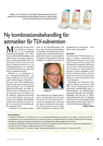 undipharma lanserar Flutiform (flutikason +formoterol), en ny receptbelagd kombinationsbehandling för astma. Den nya läkemedelsbehandlingen, som administreras via en spray, ingår dessutom i högkostnadsskyddet efter ett TLV-beslut i slutet av förra året. Flutiform (flutikason+formoterol) är ett behandlingsalternativ för astmatiker som inte får kontroll på sin astma med enbart en inhalationssteroid. Flutiform är en kombination av den inflammationshämmande substansen flutikason och den långverkande luftrörsvidgaren formoterol. I dag finns inget annat kombinationspreparat med samma substanser. Kliniska prövningar visar att Flutiform (flutikason+formoterol) ger bättre effekt än vad dess substanser gör var för sig. Dessutom har fas III-studier visat att Flutiform (flutikason+formoterol) är minst lika effektivt som dess substanser givna samtidigt direkt följande varandra och ytterligare en annan studie visar att den har en betydligt snabbare insättande effekt. – Flutiform är ett utmärkt komple-