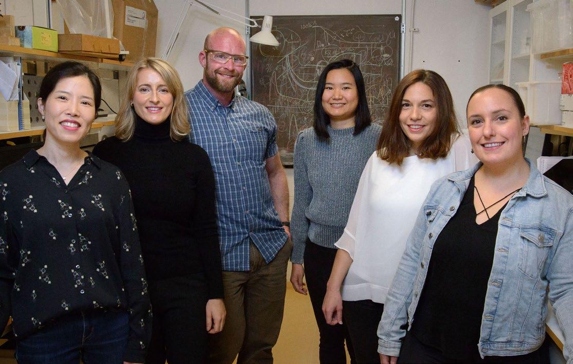 Några från teamet. Jeanha Baek, Head of Preclinical Development, Sana Alajmovic, CEO and Cofounder, Eric Johnston, CTO & COO, Porraphun Rieanjarernsuk, Business Developer, Ghislaine RobertNicoud, IP Manager & Material Scientist, Melissa Borg, Preclinical Researcher Foto: Sigrid Therapeutics.