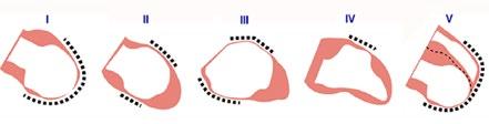 Olika typer av ”ballonering” som förekommer: I är apikal (rör spetsregionen) och är vanligast, II angriper mellanregionen och III hjärtats basregion. IV visar en ofullständig apikal variant, och V visar att bägge kamrarna kan angripas, eller t.o.m. endast höger kammare.
