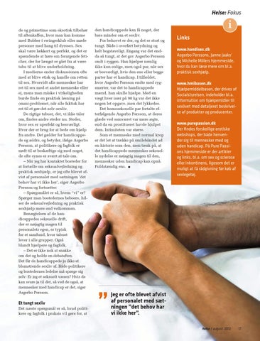 Helse: Fokus de og primetime som eksotisk tilbehør til aftenkaffen, hvor man kan komme med Bubber i swingerklub eller møde personer med hang til dyresex. Sex skal være lækkert og perfekt, og det er spændende at høre om forargende feticher, der for længst er gået fra at være tabu til at blive underholdning. I medierne ender diskussionen ofte med at blive etisk og handle om retten til sex. Hvorvidt alle mennesker har ret til sex med et andet menneske eller ej, mens man måske i virkeligheden burde finde en praktisk løsning på onani-problemet, når alle faktisk har ret til et gør-det-selv-sexliv. De rigtige tabuer, det, vi ikke taler om, findes andre steder nu. Steder, hvor sex er uperfekt og besværligt. Hvor der er brug for at bede om hjælp fra andre. Det gælder for handicappede og ældre, og betyder, ifølge Asgerbo Persson, at politikere og fagfolk er nødt til at beskæftige sig med noget, de ofte synes er svært at tale om. – Når jeg har kontaktet bosteder for at fortælle om seksualvejledning og praktisk sexhjælp, er jeg ofte blevet afvist af personalet med sætningen ’det behov har vi ikke her’, siger Asgerbo Persson og fortsætter: – Spørgsmålet er så, hvem “vi” er? Spørger man bostedernes beboere, hilser de seksualvejledning og praktisk sexhjælp mere end velkommen. Benægtelsen af de handicappedes seksuelle drift, der er nøjagtig magen til personalets egen, er typisk for et samfund, hvor tabuet lever i alle grupper. Også blandt hjælpere og fagfolk. – Det er ikke nok at snakke om det og holde en debataften. Det får de handicappede jo ikke et blomstrende sexliv af. Både politikere og bostedernes ledelse må spørge sig selv: Er jeg et seksuelt væsen? Hvis de kan svare ja til det, så ved de også, at mennesker med handicap er det, siger Asgerbo Persson.
