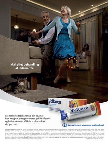 Modsat smertebehandling, der påvirker hele kroppen, trænger Voltaren gel ind i leddet og lindrer smerten effektivt – direkte hvor det gør ondt. Forbrugerinformation for Voltaren gel. Voltaren gel indeholder diclofenac. Virkning: Er betændelsesnedsættende (anti-inflammatorisk) og smertestillende og anvendes imod lokale smerter i muskler, sener og led. Dosering: Voksne og børn over 14 år: 2-4 g gel påsmøres huden 3-4 gange dagligt dér, hvor det gør ondt. Brug ud over 7 dage bør kun ske efter aftale med lægen. Bivirkninger: Omfatter milde og forbigående hudreaktioner på det behandlede hudområde. Op til 10 % kan opleve udslæt, eksem, erytmen, dermatit og pruritus. Sjældent ses blæredannelse på huden. Meget sjældent ses overfølsomhed, sammentrækning af bronkierne, astma, tørhed, pustuløst udslæt, nældefeber eller lyssensibilitet. Forsigtighedsregler: Bør ikke anvendes af personer, hvor acetylsalicylsyre eller andre NSAIDer fremprovokerer astma, nældefeber eller snue. Bør kun anvendes på intakt rask hud og ikke på åbne sår eller ved svær akne. Bør ikke komme i kontakt med øjne eller slimhinder. Undgå overdreven udsættelse for sollys for at forhindre lysoverfølsomhedsreaktioner. Er ikke beregnet til brug under tætsluttende forbinding. Særlig forsigtighed af NSAIDer bør udvises hos ældre patienter. Samtidig anvendelse af oral NSAIDer kan øge forekomsten af bivirkninger. Bør ikke bruges af gravide og ammende. Kan påvirke chancen for at blive gravid. Pakninger: Voltaren gel 11,6 mg/g, 50 g, 100 g og 150 g. Inden brug af produktet, bør vejledningen i og på pakningen læses grundigt. Novartis Consumer Health – tlf. 39 16 84 00. helseCHDK/CHVOLT/0001/16a / december 2016 01/2016 5 Dato for produktresumé: 03/2014. Læs mere på www.voltaren.dk. Fås i håndkøb.