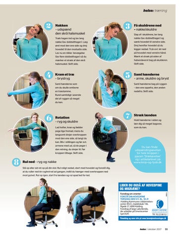 Slap af i skuldrene, lav lang nakke (lav dobbelthager) og sænk hovedet til venstre side. Drej herefter hovedet så du kigger nedad. Tryk evt. let ned på hovedet med venstre hånd. Mærk et stræk på siden af halsen/øverst bag på skulderen. Skift side.