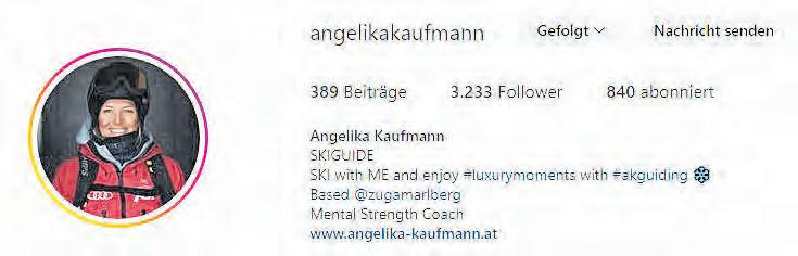 ANGELIKAKAUFMANN: Das Motto der Vorarlbergerin aus Zug ist „Go Play Outside“: Beim Wandern, Freeriden, Tourengehen und Skifahren fühlt sie sich unbeschwert und frei. Sie ist Mental Strength Coach, Skilehrerin und Ski Guide und freut sich darauf, mit ihren Gästen ihre Heimatregion, den Arlberg, zu erkunden.