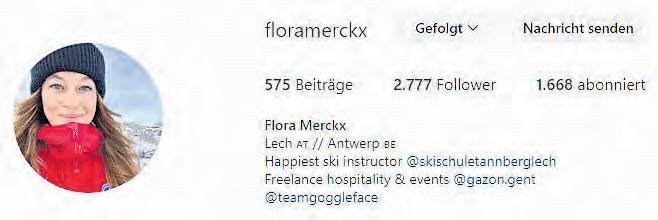 FLORAMERCKX: Die gutgelaunte Belgierin ist auf der ganzen Welt unterwegs, wenn sie nicht gerade im Winter in der Skischule Tannberg in Lech unterrichtet. Auf ihrem Foto-Account entführt sie uns in die weite Welt, nimmt uns mit auf ihre Reisen und teilt ihre schönsten Eindrücke vom Winter, dem Skifahren und Lech Zürs.