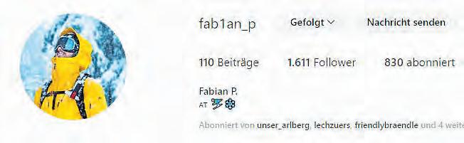 FAB1AN_P: Wunderschöner Fotoaccount, der einen auf eine Reise auf die ganze Welt mitnimmt und Lust auf mehr macht. Im Winter zeigt uns Fabian den wunderschönen Arlberg mit vielen beeindruckenden Videos und Bildern. Auch GoPro-Videos von Heliskiing und Freeriden im tiefen Powder sind mit dabei.