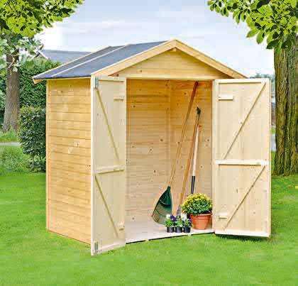 Fichte, unbehandelt, Doppeltür mit Riegel, Satteldach. Ca. B 170 x H 218 x T 120 cm. Inkl. Fußboden. Ohne Dachpappe. Versch. Ausführungen. Art.-Nr. 482331