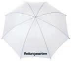 Weißer Taschenschirm mit Aufdruck „Rettungsschirm“ weißer Automatik-Regenschirm, Durchmesser 100 cm, Aluminium speichen. Schwarzer Aufdruck „Rettungsschirm“ ca. 30 cm. Kleines „Schenken mit Sinn“-Logo.
