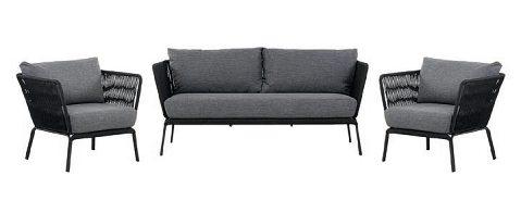 Sessel: 78 x 80, H 80 cm; Sofa: 176 x 80, H 80 cm; Hocker: 53 x 53, H 30 cm; Gestell: Alu Schwarz matt pulverbesch., Textil/Seil: Dunkelgrau 2.290€