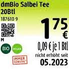 dmBio Soft Tomaten 100g 245 € 24,50€ je 1kg IMMERGÜNSTIG seit 03.2022 2,45€ dmBio Guten Abend Tee 20Btl 165 € 0,08€ je 1Btl IMMERGÜNSTIG seit 06.2022 1,65€ dmBio Caffé Crema de Peru ganze Bohne 500g 695 € 13,90€ je 1kg IMMERGÜNSTIG seit 06.2022 6,95€ dmBio Glutenfrei Gemüsebratlinge 140g 165 € 11,79€ je 1kg IMMERGÜNSTIG seit 06.2023 1,65€ dmBio Not M*lk and so yummy Pflanzliche Milchalternative 1l 160 € IMMERGÜNSTIG seit 06 2023 1,60€ dmBio Fruchtringe 300g 245 € 8,17€ je 1kg IMMERGÜNSTIG seit 02.2023 2,45€ dmBio Flohsamenschalen 200g 565 € 28,25€ je 1kg IMMERGÜNSTIG seit 08.2023 5,65€