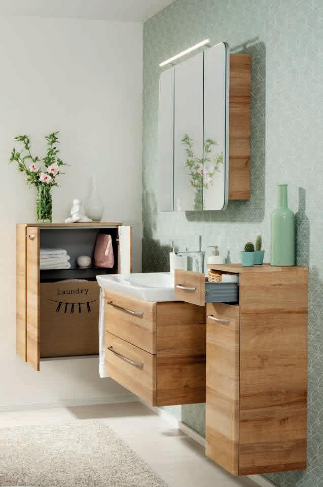 Badezimmereinrichtung mit Stauraum. Gedämpfte Scharniere und Auszüge. Versch. Dekore und Größen, z. B. Ast-Eiche. „Contura Light“ optional und Wand- und Highboard zusätzlich erhältlich.