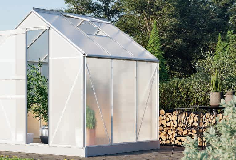 Optimal zur Anzucht von Pflanzen. 4-mm-Hohlkammerplatten, Dachfenster, Einzeltür, UV-beständig, Aluminium. B 195 x H 197 x T 195 cm. Ohne Regal und Deko. Gewächshaus „3800/4ET“ Grundfläche 3,8 m², Art.-Nr. 45334600, 279.- € Fundament, für Standsicherheit, Art.-Nr. 45334601, 109.- €
