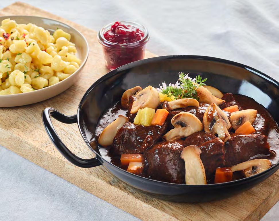 Wilderer Pfanne von der Hirschkeule, mit Pilzen, dazu Butternockerl und Preiselbeeren Ofenfrischer