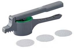 Mit der Kartoffel- und Spätzlepresse werden Kartoffeln, Teig & Co. schnell und einfach gepresst. Die Presse wird mit verschiedenen Lochscheiben geliefert, die jeweils eine andere Stärke haben (2-3 mm). Der ergonomische Griff und vier Auflagehaken für Töpfe und Schüsseln sorgen für ein sicheres und komfortables Arbeiten.