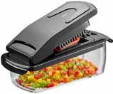 Schneller und bequemer kann man Obst und Gemüse nicht in bunte Würfel oder vielseitig verwendbare Stifte verwandeln. 2 austausch- und arretierbare Schneidgitter für feine (7 x 7 mm) und grobe (13 x 13 mm) Stifte oder Würfel, zerlegbar zur leichten Reinigung, Aufbewahrungsdeckel und Reinigungskamm inklusive, Antirutschfüße, spülmaschinengeeignet.